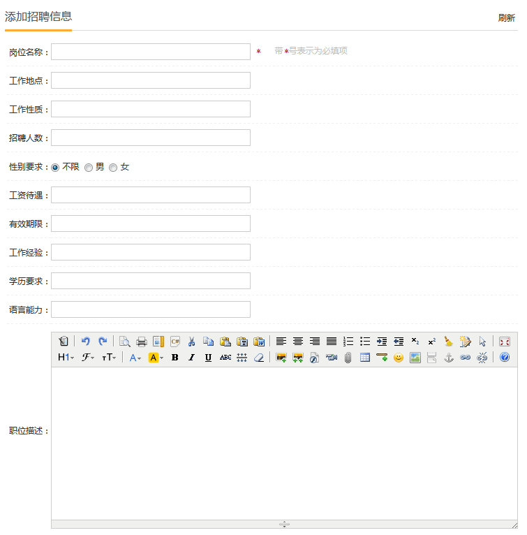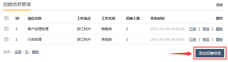 招聘系统管理:主要输出在招聘系统添加的主要信息,方便管理员管理。点击“添加招聘信息”可添加新的招聘信息。