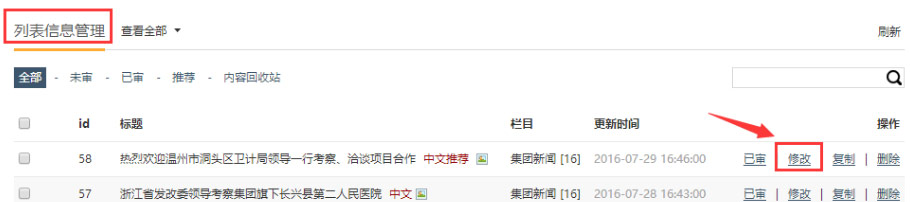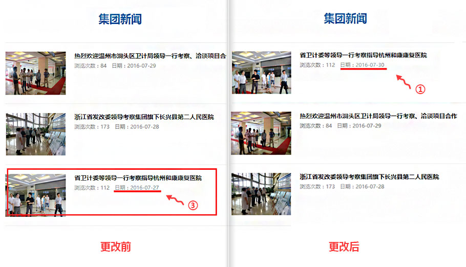 把第三条新闻排在最前面,即将第三条新闻的日期按上述步骤修改为2016-7-30,修改后如下(修改对比图):