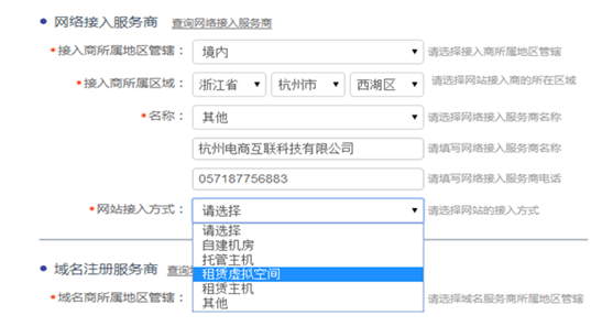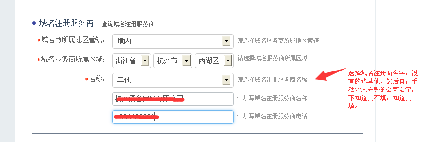 8、 填写域名注册商信息:如果域名也是我们这边买的,则域名注册服务商信息也一样。如果是别的地方购买的域名,则需要填写相应的域名注册商信息。