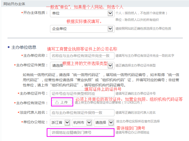 4、“开办主体管理”录入信息。根据系统指示提醒填写主体信息和负责人信息并上传相应证件,填写时看填写提示填写,负责人据实填写,可以是法人,可以其他具体责任人,但信息要真实正确,最后点保存。注意:1.证件图片大小控制在512k内。2.负责人:互联网信息服务企业请填写公司法人或法人授权负责人;其他单位请填写负责网站营维护管理部门的负责人。
