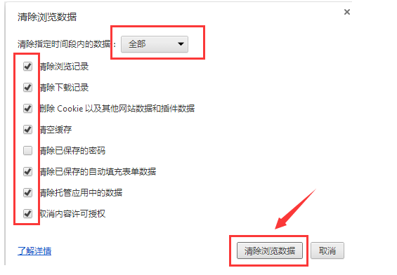 3、选择要清除数据的时间段和内容选项,点击“清除浏览器数据”,清理后重新打开浏览器即可使用;
