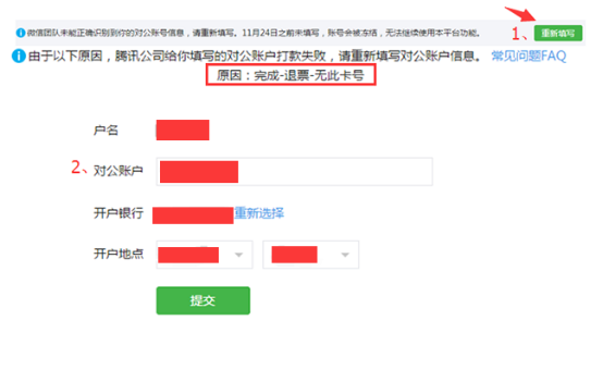 若超过3个工作日仍未收到验证码,可能是由于填写的对公账户信息错误导致银行退票,这时记得登录微信公众平台,留意页面的通知与提醒。 确认没有收到验证信息,需要重新填写。